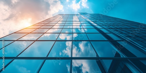Modern blue glass skyscraper featuring a geometric facade and reflective surfaces against a clear sky with soft pastel clouds, showcasing contemporary urban architecture in minimalist design.