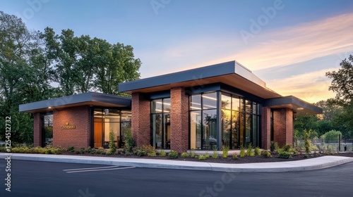 Modern Brick Building with Glass Windows and a Sunset Sky