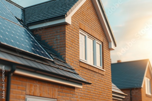 Modern Brick House with Solar Panels and Rooftop Windows Sustainable Home Design