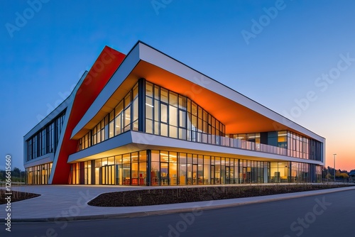 Modern Building with Glass Facade and Red Accent