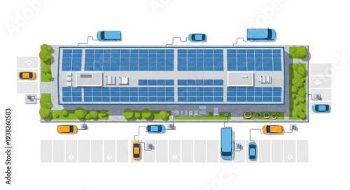 Modern Building with Rooftop Solar Panels and Electric Cars Charging.