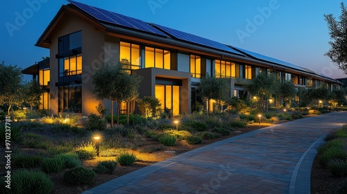 Modern building with solar panels and landscaped pathway at dusk.