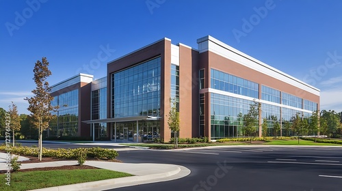 Modern business complex with landscaped gardens and glass architecture : Generative AI
