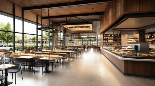 Modern Cafe Interior with Natural Light and Wooden Accents Featuring Tables and Open Kitchen Design