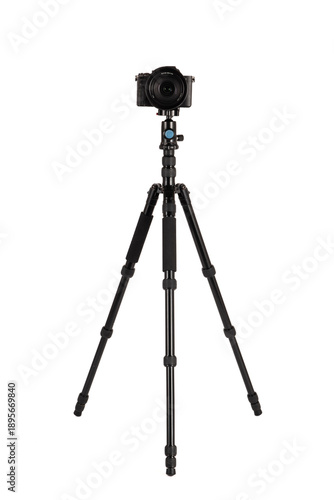 Modern camera with tripod isolated on white background. Photographer's equipment