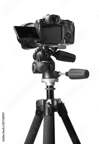 Modern camera with tripod isolated on white. Photographer's equipment