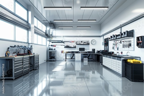 Modern Car Service Workshop with Organized Workstations and Equipment for Professional Repairs