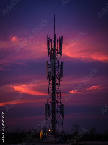Modern cell tower against vibrant sunset sky creating a striking silhouette in the evening