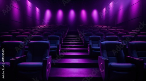 Modern Cinema Interior with Rows of Plush Purple Seats and Ambient Lighting for a Unique Movie Experience