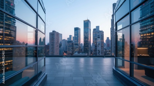 Modern Cityscape at Sunset with Glass Facade and Urban Skyline