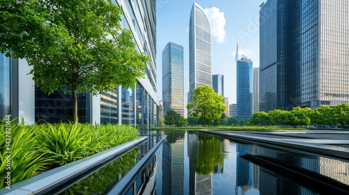 Modern cityscape featuring sleek skyscrapers and lush greenery amidst tranquil water reflections.