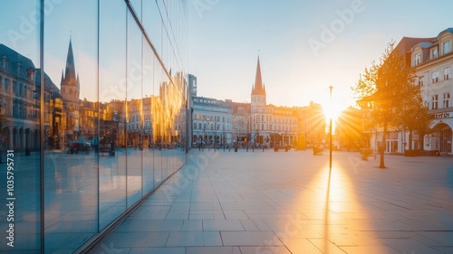 Modern cityscape reflecting sunset, featuring glass buildings and historic architecture.