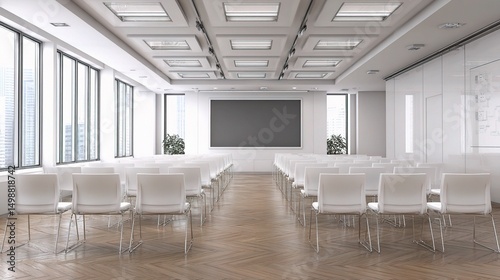 Modern Classroom Arrangement with White Chairs and Bright Windows