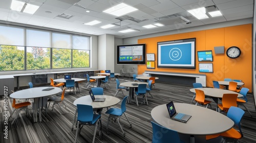 Modern classroom featuring bright colors, interactive technology, and a spacious layout for collaborative learning activities.