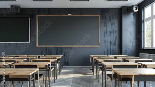 Modern classroom interior with empty desks and chalkboard, bright natural light streaming in
