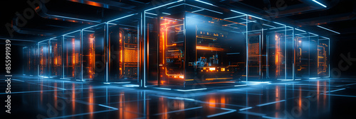 Modern Compact Data Center with High-Tech Server Racks and Glowing Neon Lights in Futuristic Setting at Night