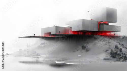Modern concrete building with red accents overlooking misty landscape