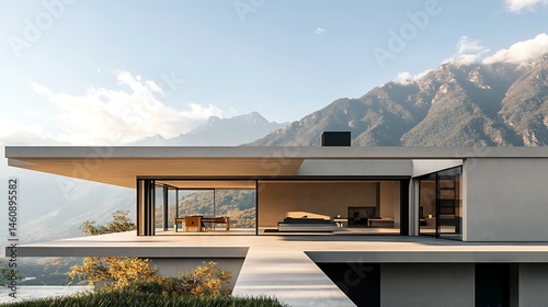 Modern concrete house with panoramic mountain views.