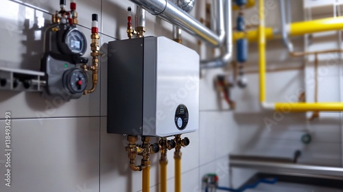 Modern condensing gas boiler heating system mounted on wall in boiler room