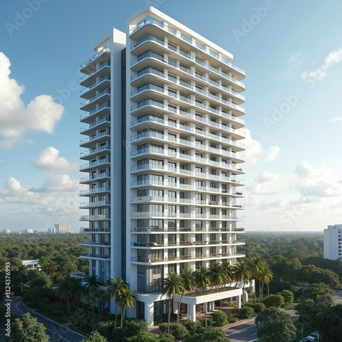 Modern condominium architecture in Doral, Miami, Florida. Luxury apartments boast balconies with city views. Residential building offers upscale urban living, real estate investment opportunity near