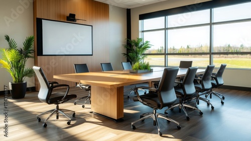 Modern Conference Room Interior Large Table Ergonomic Chairs Projector Plants Sunny Window