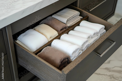 Modern contemporary dresser with an open drawer revealing neatly arranged essentials and stylish organizational details