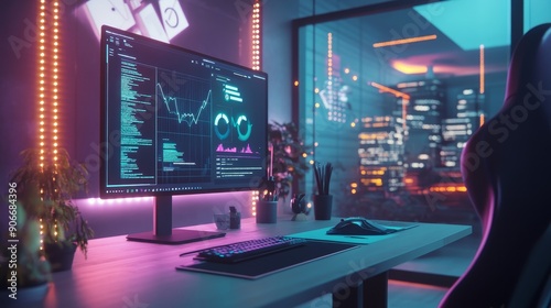 Modern Content Creation Workspace with Digital SEO Graph and Ambient Lighting.