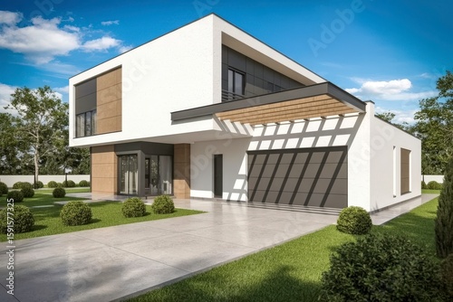 modern cozy house with garage for sale or rent with large garden and lawn. Clear sunny summer day with cloudless sky.