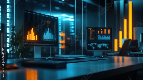 Modern Data Analysis Workspace with Futuristic Digital Displays
