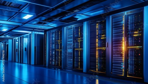Modern data center server room with glowing blue lights