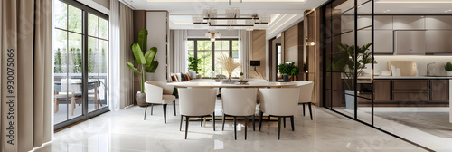 Modern Dining Room Interior Design with White Chairs and Glass Doors - 3D Illustration