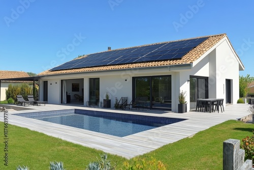 Modern eco friendly house with solar panels and a swimming pool in a serene natural setting