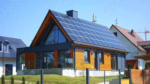 modern eco friendly passive house with new photovoltaic system on the gable roof and solar panels for energy efficiency