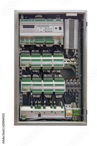 Modern electric control cabinet with sophisticated electronic devices isolated on a white background