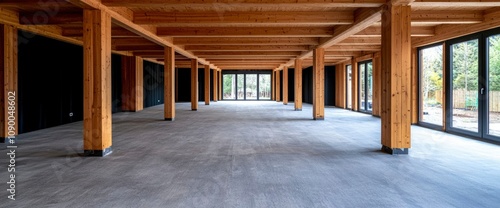 Modern Empty Commercial Space with Wooden Beams and Concrete Floor