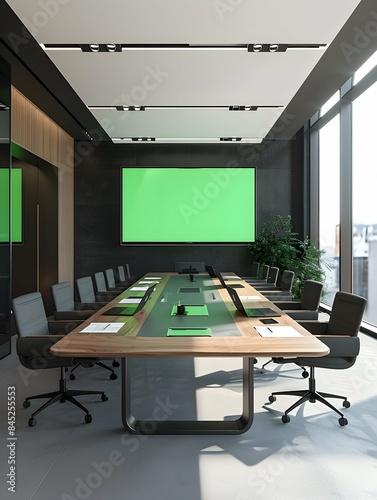 Modern Empty Meeting Room with Big Conference Table with Various Documents and Laptops on it, on the Wall Big TV with Green Chroma Key Screen. Contemporary Minimalistic Designed Workplace --ar 3:4 --s