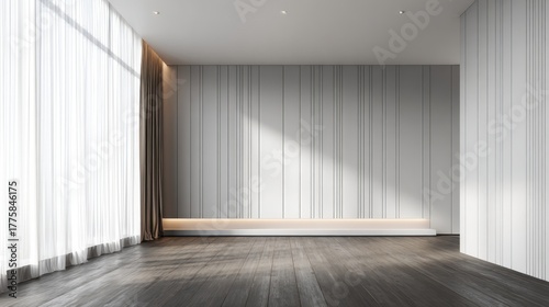 Modern Empty Room with Wood Flooring, White Walls, and Sunlight Streaming Through Curtains