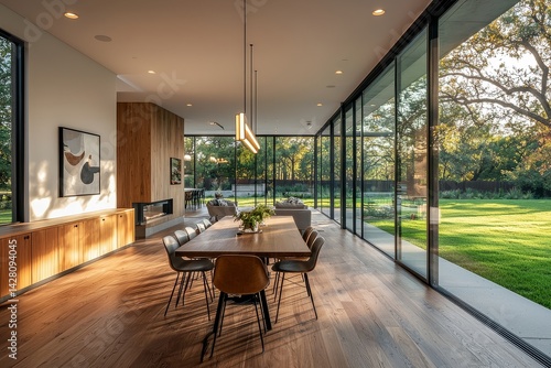 Modern farmhouse-style dining room in Texas with large windows, wood floors, glass door leading to the backyard, elegant table with chandelier, and sideboard with artwork.