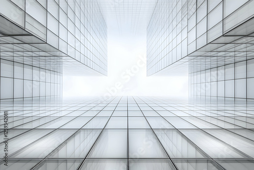 Modern glass architecture, futuristic cityscape, urban design, bright sky view between buildings.