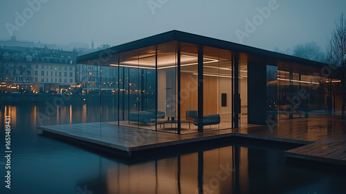 Modern glass building smart architecture waterfront evening illuminated minimal design serene cityscape reflection
