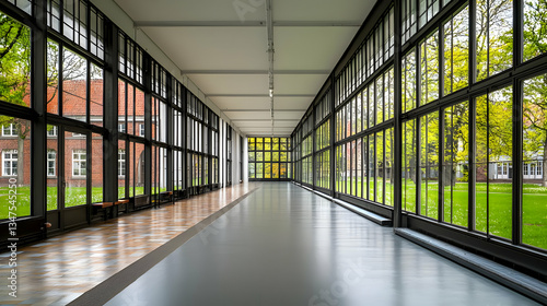 Modern Glass Corridor Interior with Reflections of Exterior Greenery and Red Brick Building Daylight