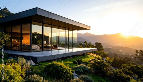 Modern glass house on a mountainside at sunset. Stunning panoramic view.