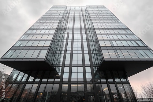 modern glass office building with reflective windows under cloudy sky with bare trees around