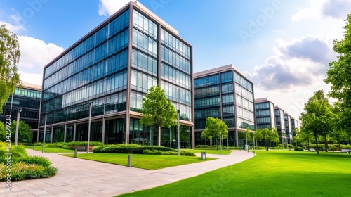 Modern Glass Office Buildings With Landscaped Grounds
