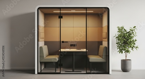 Modern glass walled office meeting pod beige soundproof panels small table two chairs
