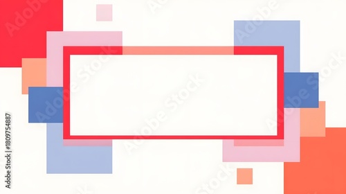 Modern graphic design featuring layered transparent geometric shapes including rectangles and squares in vibrant colors creating a textured background with a prominent empty white area for text