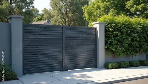 Modern gray metal gate with horizontal louvers. Home fence with shutters and blinds, secured property with exterior detail. Outdoor background.