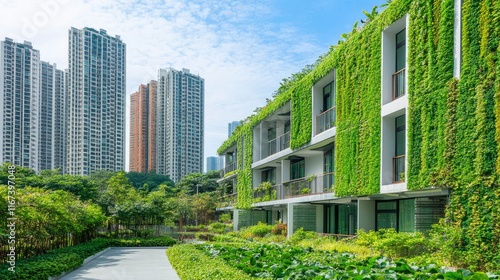 Modern Green Building With Lush Vertical Gardens And Cityscape