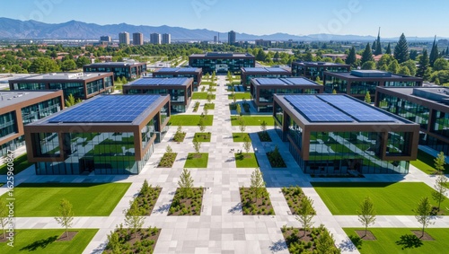 Modern Green Office Park with Solar Panels on Rooftop Buildings – Sustainable Corporate Architecture.