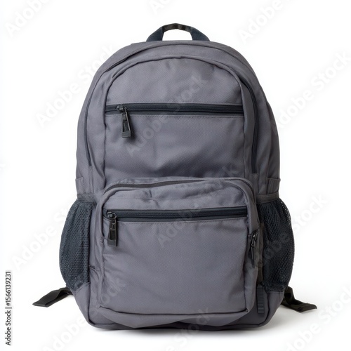 Modern grey backpack with multiple zippers and mesh pockets isolated on white background